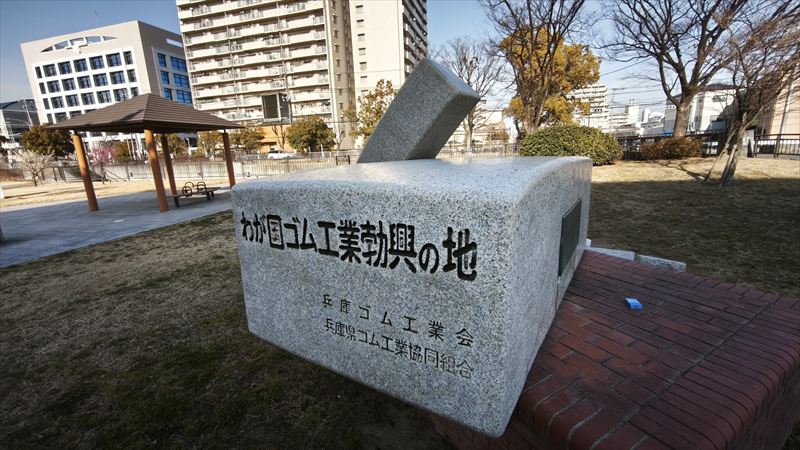 今は新長田と言われ、阪神・淡路大震災まではケミカルシューズの工場が所狭しと密集し、ゴムの匂いが漂うイメージがあり、「ゴム工業勃興の地」の石碑もありました。
