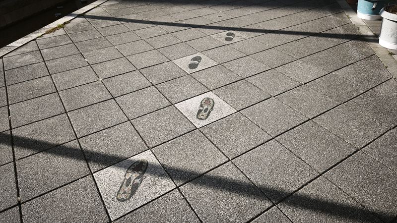 歩道に、シューズの足跡もありました。