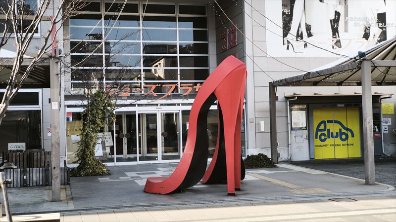 シューズプラザ前の高いヒールの赤い靴が象徴的です。