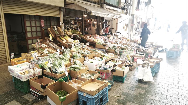 西端の八百屋さんが店先にいっぱいの野菜を並べていました。西隣が昔ながらのレコード屋さんとなります。