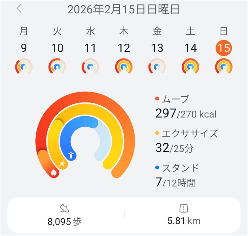 運動消費カロリーが297kcalで、エクササイズが32分、歩数が8,095歩でした。