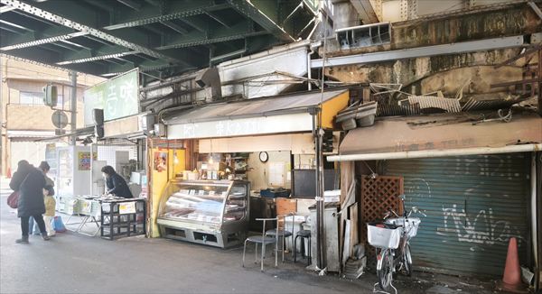 大安亭の北側の阪急の高架下部分の店、下町情緒が溢れて、昭和時代の光景そのままです。