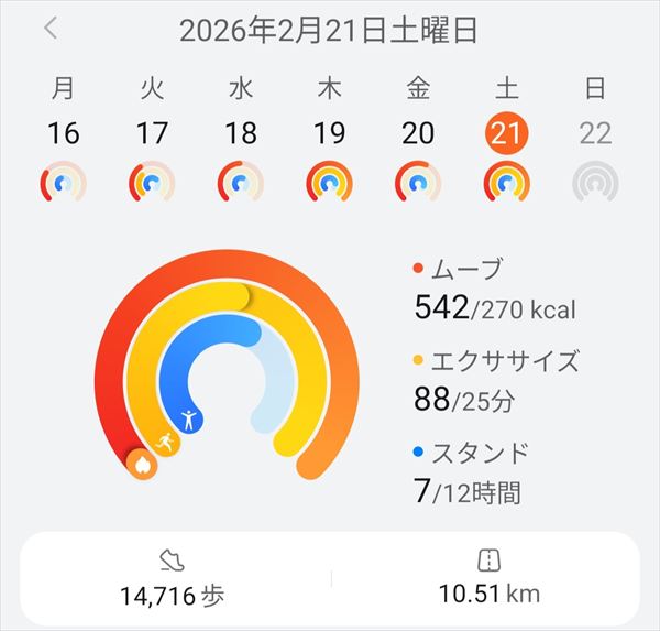 結構、坂の街・神戸の旧市街地を歩き廻ったので、運動消費カロリーが542kcal、エクササイズが88分、歩数が14,716歩でした。