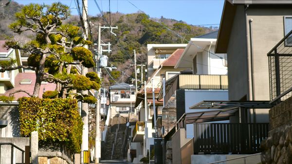 その南北が坂になって東西に細長い旧市街地で、もっとも山側(北型)を東西に走る道路が山麓線で、三宮から阪急六甲までは市バスの2系統が走っている市バスのドル箱路線です。その山麓線の西谷線から北を眺めると、山の麓まで住宅が建ち並んでいます。