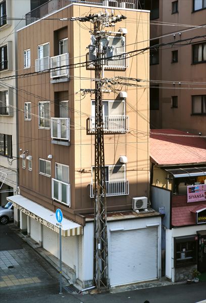 帰路は、そのまま坂を下りながら三宮方面に向かうと、春日野道から大安亭方面となりました。昔、中大安亭という短いアーケードがあった辺りに、鉄柱製の配電柱がありました。神戸市内ではかなりレアな存在です。