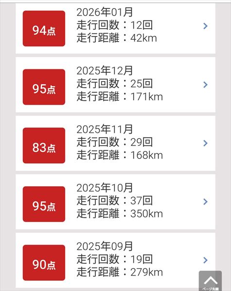 1月中旬から2月中旬までの一か月単位の運転レポートが送られてきました。この一ヵ月はあまり運転していなかったです。運転をモニターされて、急ブレーキと急アクセルのチェックが入るようになって、運転が少し穏やかになりましたが、でも運転が楽しくなくなって、つい評価点数の減点を気にしてしまいます。