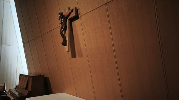 チャペル真正面の十字架、プロテスタントでは十字架だけで、カトリックではイエスが磔にされていますが、聖公会ではハイチャーチ・ローチャーチのように、カトリック寄りとプロテスタント寄りがあるようですが、イエスが磔にされているので、このチャペルはハイチャーチなのかなあ~と・・・