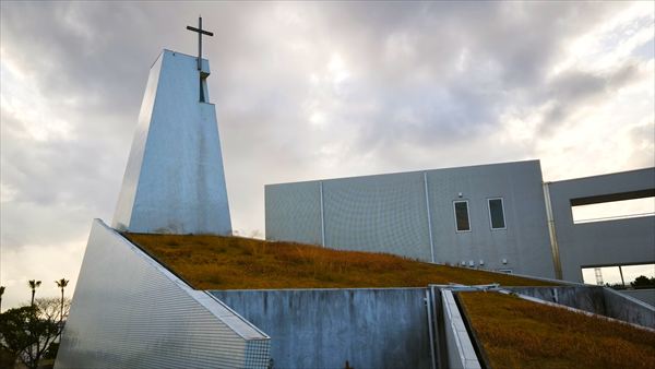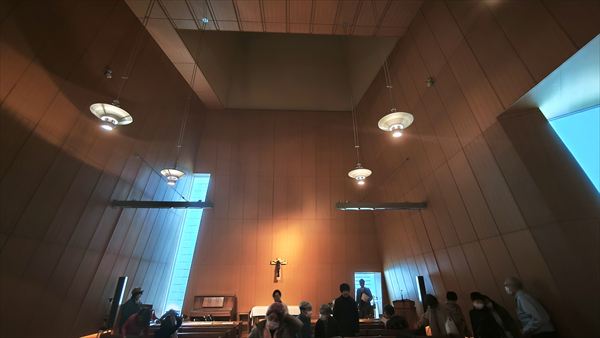 チャペルの天井部分を超広角で撮ると・・・ちょうど教壇の上の部分がチャペルの塔になり、空洞になっているので、音が吹き抜けになって、高さが20m以上あるようです。音響的に考慮して設計したチャペルだそうです。