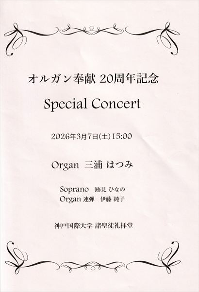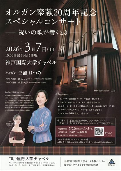 地元の神戸・垂水で、八代学院大学として開学して、その後神戸国際大学に大学名を変更して、2002年にキャンパスを神戸・東灘の人工島・六甲アイランドに移転した、聖公会のミッションスクールで、キャンパス内のチャペルのパイプオルガンが20周年ということで、記念のコンサートでした。