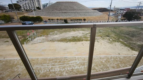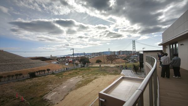 五色塚古墳の北側の空き地に建設されたので、前方後円墳の「後円」部分は、確かに真正面に見ることが出来ますが「前方」部分は、わずかに見えるだけで、五色塚古墳を俯瞰する位置でもなく、2階テラスからだと見下ろす位置でもなく、何となく中途半端な展望のように感じました。ガラスに白線でイラストが描かれていましたが、明るくて見えにくかったです。