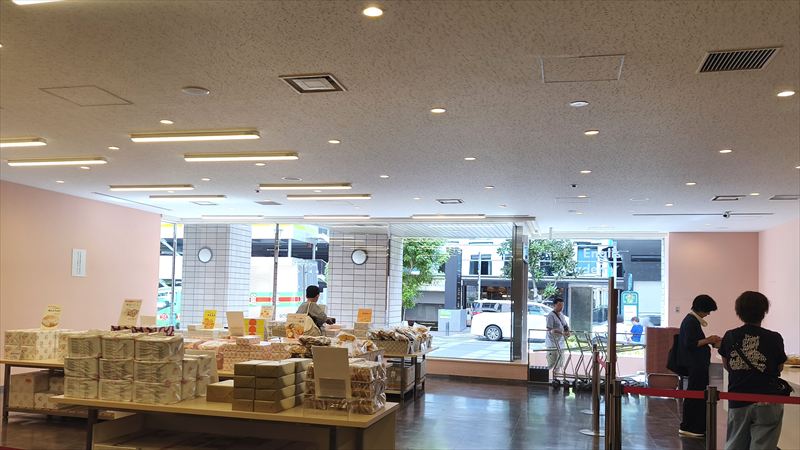 店舗内は質素そのもので、ショーウインド等は一切なく、包装済みのおかきの箱や袋がテーブルに積まれて、それをレジカウンターの持って行って会計をするタイプです。これは生野の本店も同じです。店の奥に無料のドリンクサービスがあって、ドリンクバーのように各自でセルフでテーブルで休憩して、買ったおかきを食べることも出来ます。