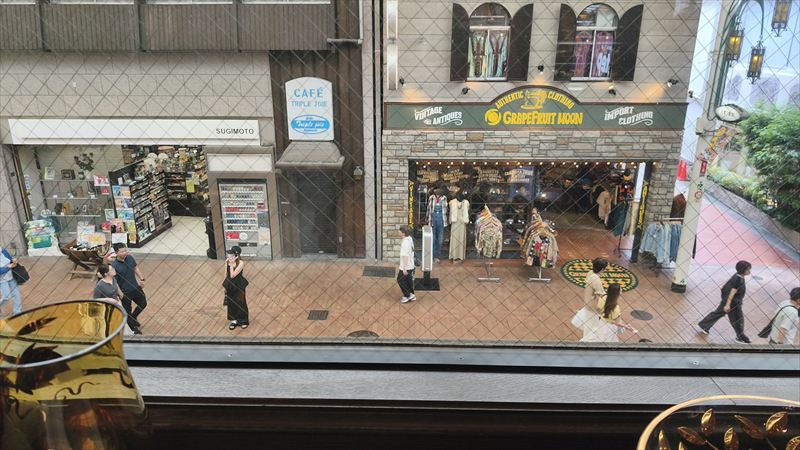 元町商店街を2階の窓から眺めた光景。以前は、3階まで店舗があった本の丸善、輸入雑貨&食料品の明治屋、子供服のファミリア本店、レコードと楽器のYAMAHAがありましたが、今は撤退や移転で、なくなっています。