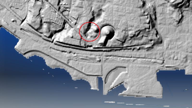 国土地理院のWebサイトで確認すると、陰影起伏図の赤丸の部分で、丘陵地の中に、かなり狭い部分の窪地がありました。この窪地のもっと低い部分に以前は小川のような流れがあったようです。