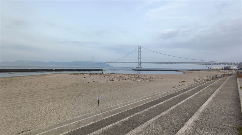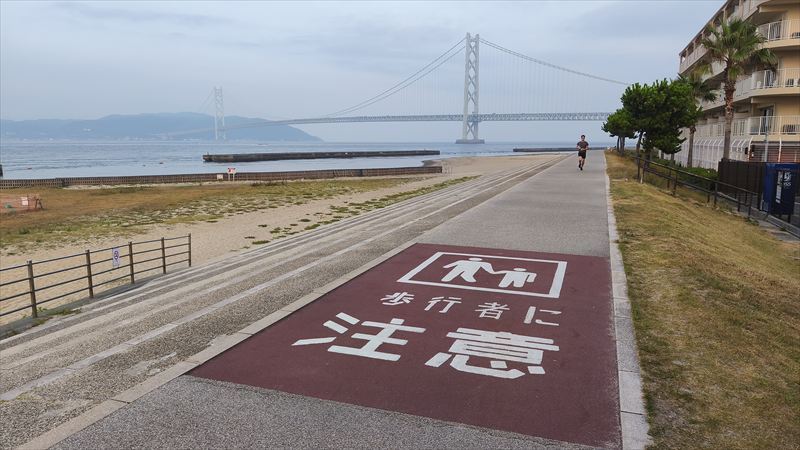 マリンピア神戸とアジュール舞子の境目ぐらい。大きく「歩行者に注意」と書かれているのは自転車への注意のようです。垂水漁港からマリンピア神戸、アジュール舞子、舞子公園を経て舞子駅まで、ちょっとした散策コースにもなっています。