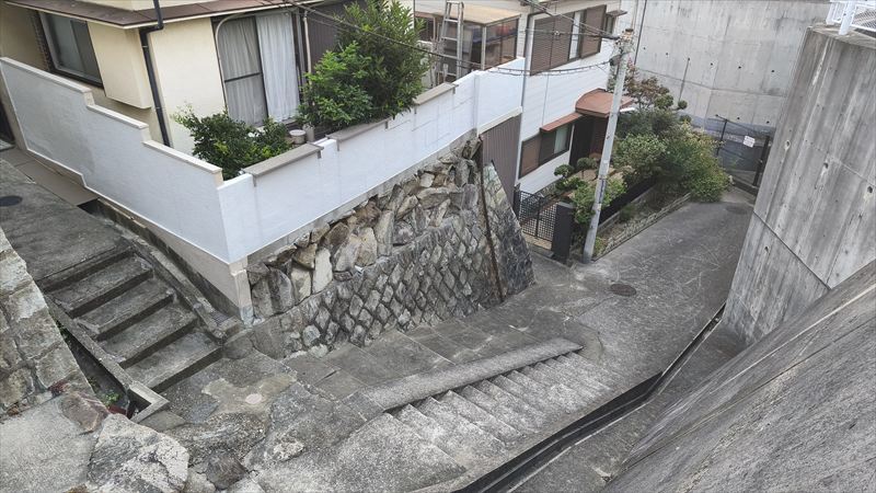 五色塚古墳の西側は、古い地図には小川のようなものがあったようで、今も小川があったと思われる一帯は窪地のようになっています。今朝、窪地に向かうような急な階段を住宅地の中に見つけました。周囲と10mぐらいの高低差がありました。
