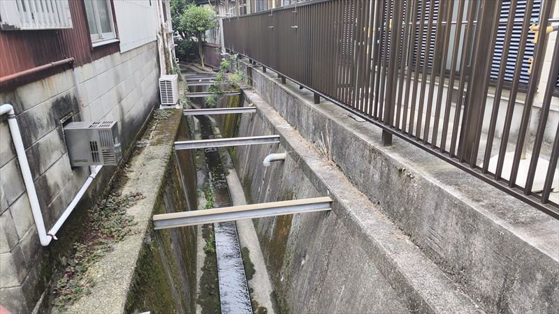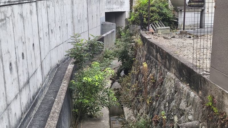 側溝のような水の流れがありました。昔の小川ではないかと思います。南の下流は暗渠になって、その先は、国土地理院の陰影起伏図では、海につながる細い低地があるので、その部分に暗渠になっているようです。