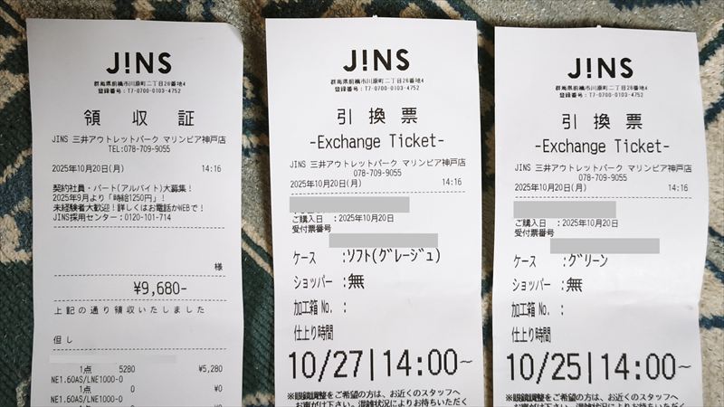 メガネを2つ作って9,680円でした、引換券を持って仕上がり時間以降に店舗に行くことになります。ひとつは車の運転用、もう一つはパソコン作業用のつもりです。