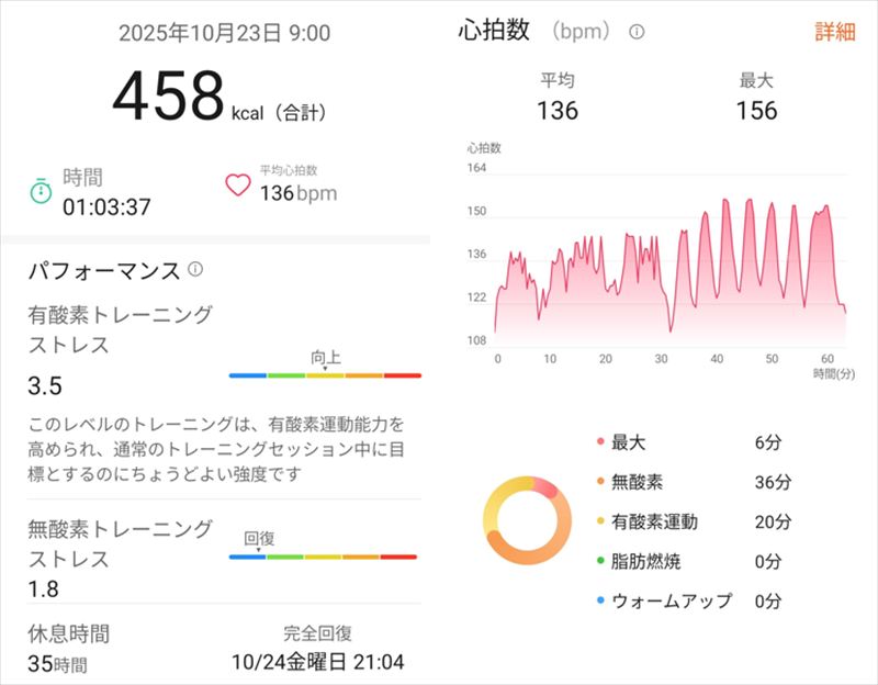 1時間3分のトレーニングで、後半30分はランニングマシンで、軽いジョギングと競歩のインターバル、心拍数のメリハリもしっかりして、長くて暑かった今年の猛暑での夏バテから、やっと脱出したようです。運動消費カロリーが458kcalで、平均心拍数が136bpmでした。
