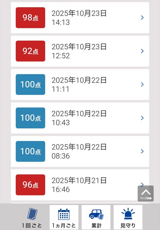 自動車保険の見守りサービス、10月中旬は100点の運転が続いていましたが、この3日間は90点台と100点が折衷しっています。詳細を見ると、交差点で曲がる時の加速が「急アクセル」と判断されて引っ掛かるようです。それと多分、信号が黄色になった時にブレーキを踏むのが「急ブレーキ」と判断されるようです。街中を走っていると、どうしようもないだろうなあ~と思います。