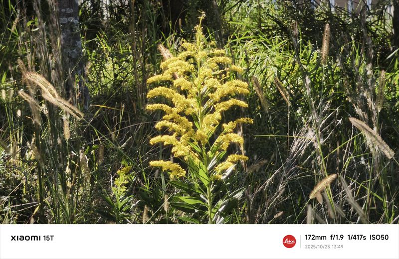 背高泡立草、繁殖力が強いので、今は忌み嫌われるようなイメージですが、元々は観賞用に北米から輸入されたようです。秋の陽射しを受けて、黄色く輝いていました。