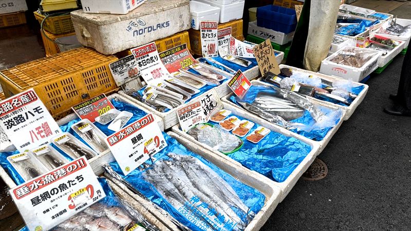 鮮魚店では地産の明石海峡近辺で獲れた鮮魚の「昼網」の魚が並んでいます。「昼網」とは午前中に目の前の明石海峡で漁をして、お昼に市にかけられ、お昼過ぎには店頭に並ぶことから付けられた名前だそうです。
