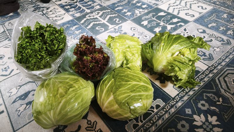 家にあったのを併せると、大きなキャベツが2玉、レタスが2玉(+冷蔵庫にも入っていました)、それとリーフレタスとサニーレタス(+冷蔵庫に入っていました)。しばらくは野菜尽くしです。