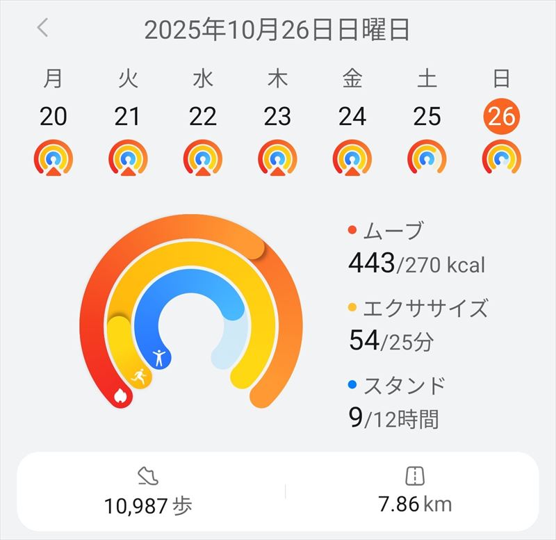 夕食前までの今日の運動量、運動消費カロリーが443kcalで、エクササイズ時間が54分、歩数が10967歩でした。