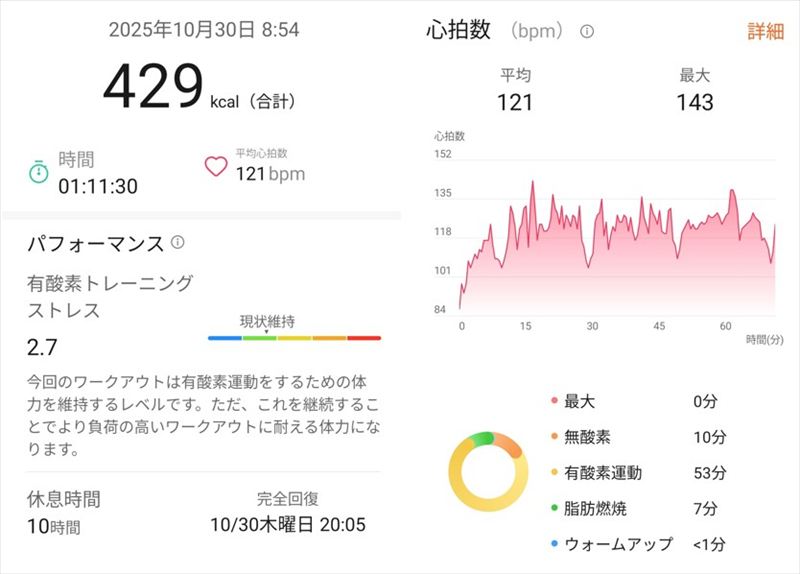 1時間11分のトレーニングで、運動消費カロリーが429kcal、平均心拍数が121bpmと、かなり低目で、有酸素トレーニングストレスも2.7で「現状維持」でした。ランニングマシンでもジョギング程度のランニングもせず、競歩を20分ぐらいでやめました。