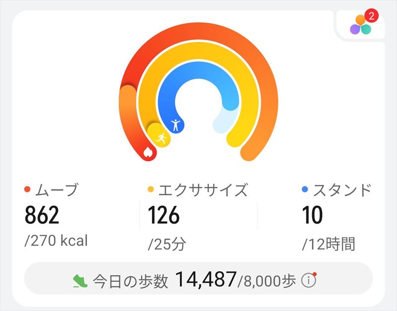 就寝前の一日の運動量ですが、運動消費カロリーが862kcalで、エクササイズ時間が126分(2時間6分)、歩数が14487歩でした。