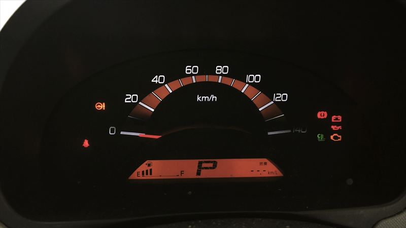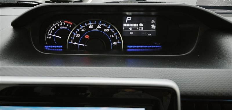 エンジンの回転数を表示するタコメータがない廉価モデルで、ハンドル越しに速度を確認していたのですが、少し表示が暗くて位置も悪く、見えにくかったです。