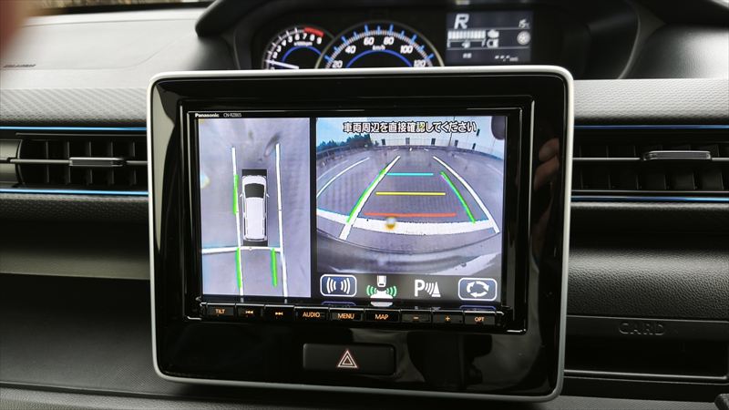 駐車時の全方位モニターの映像です。自宅の駐車場は狭いので、ピーピーとアラームが鳴って、気が散って駐車に手間取り、何度もやり直しました。すぐ後ろに自転車があるので、その警告音が特にうるさいです。
