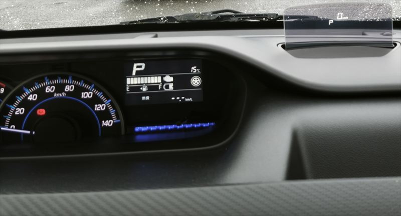 運転席の目の前に、透明のアクリル板のようなものにクッキリとスピードとドライブ状態が表示され、スピードメータをチラッと見なくても、運転している視野の中でスピードが確認されるのも便利です。