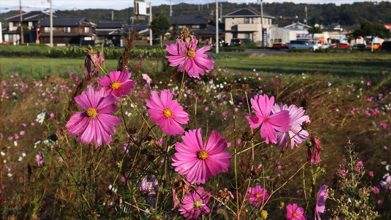 ここが田んぼだったのか、畑だったのか、それとも休耕田だったのか、広がる田畑の片隅に佇むように咲く秋桜の花々が秋の陽射しを受けている姿に、可憐さを感じました。