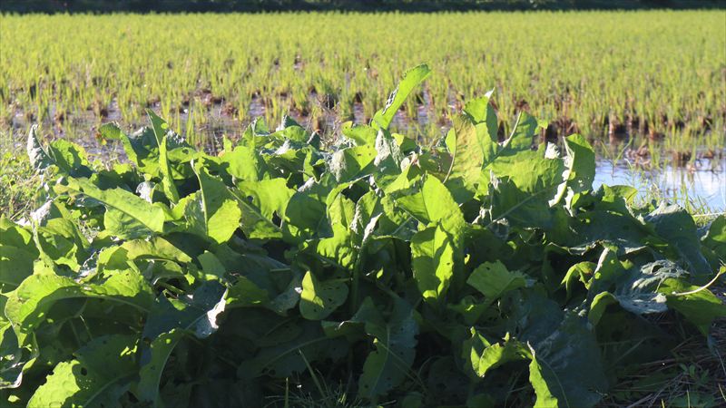 畦道の雑草が、朝陽に透けて輝いていたので、ヒコバエが広がる田んぼをバックにレンズを向けました。