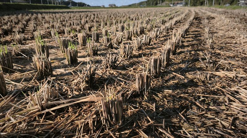 同じ寺谷でも、水を抜いている田んぼでは切株からヒコバエが芽生えることなく、切株が枯れた光景が続いていました。