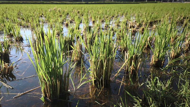 寺谷の田んぼで、水を抜いていない田んぼでは、稲の切株からヒコバエがすくすく育って、一面が青々していました。
