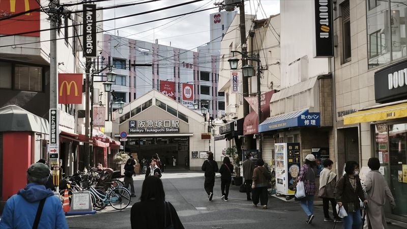 阪急塚口駅、南側は駅前のモールやバスターミナルのようなものがありますが、北側は道が放射状になっており、当初は駅前に商店がある程度で、ずっと住宅地が広がっていたかもしれません。