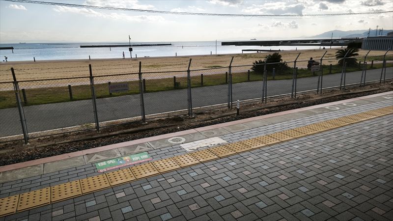 須磨行の普通に乗って、須磨で折り返し。以前は駅の南にアスファルトの道路はなく、駅の南口をの階段を降りると砂浜でした。須磨海水浴場が駅のすぐ南に広がっています。