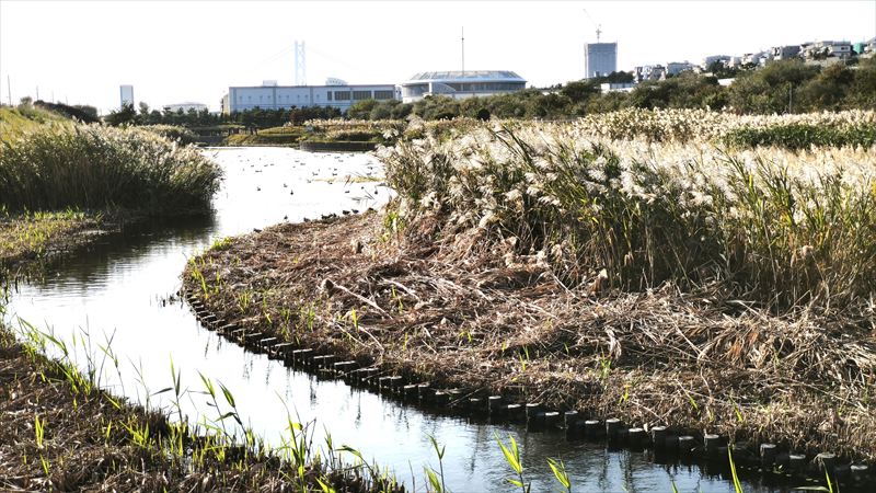 神戸近辺では、川や池の淵はコンクリートで固められて、自然な汀、湿地帯を目にすることがないです。加古川の河口付近では堤防の中の河川敷の河辺付近は葦が密集しているのも目にするぐらいです。