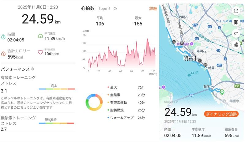 2時間4分のサイクリングで、24.59kmの走行で、運動消費カロリーが595kcalでした。