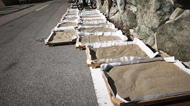 林崎漁港の水産加工場の前で、砂を干していました。水産加工の何かの使うのだと思いますが、何かわかりません。