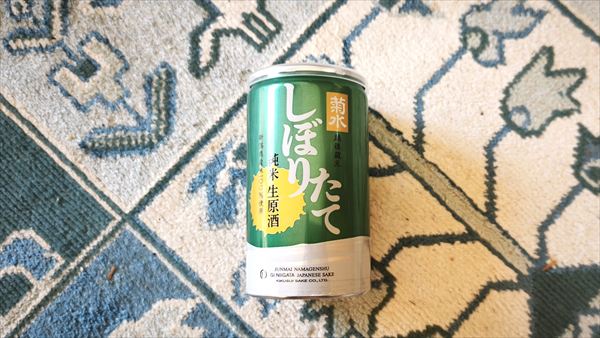 リカーショップでお正月用のお酒を探していると、お気に入りの越後・新発田の缶詰の菊水酒造の「ふなくち」という原酒生酒の横に、「しぼりたて」と書かれた缶詰のお酒があり、手に取ると同じ菊水酒造でした。少し値段が高いですが「純米生原酒」と書かれており、そそられて買ってしまいました。帰宅して菊水酒造のWebサイトを閲覧すると、どうも新製品のようです。